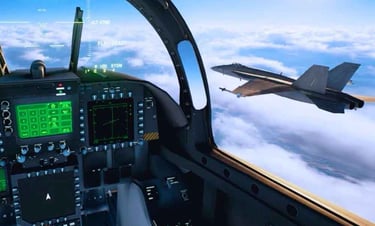 Embarque em um aviação caça, como um piloto profissional em uma experiência imersiva de pilotagem, com mapa, trafego área real e visuais de tirar o fôlego.